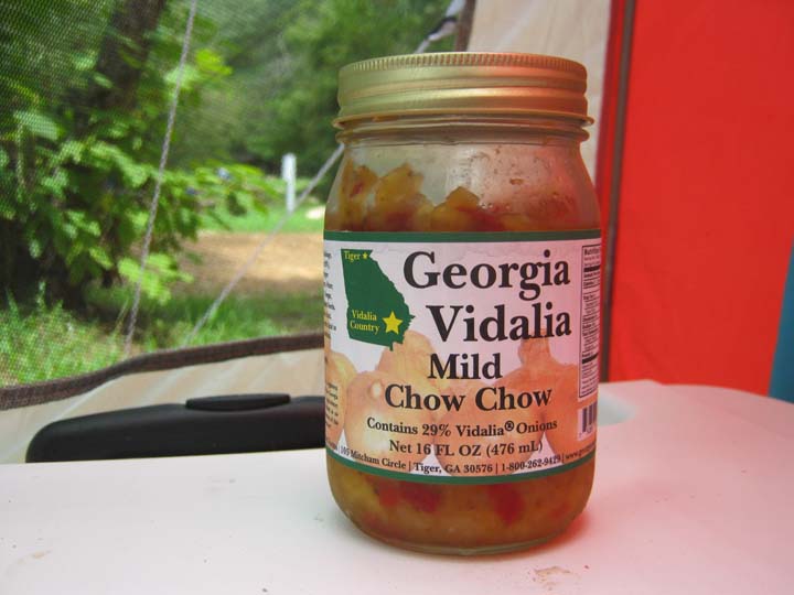 Oh, did I mention the rain? It poured and poured and poured and poured and poured. Lightning and thunder, lots of rain, arks floating by on the river, you name it, we got it. But the tent doesn’t leak, and we did manage to build a campfire between storms where we roasted hot dogs on sticks and had a chance to sample some of the “Chow Chow” (onion relish) that we had purchased in Georgia, at a roadside fruit stand.