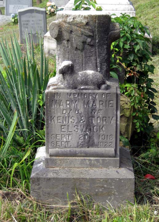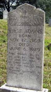 This one we know a story for. Apparently Margaret Record Biggs Coleman was 16, and the mother of a small child, when she was electrocuted getting out of the bathtub. She slipped and instinctively grabbed a light fixture (probably a bare light bulb hanging on a wire from the ceiling) to break her fall, but was killed by the electricity. At least, that’s the story they tell around here.