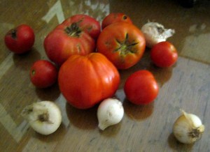 Fresh produce from the neighbor’s yard … they may not look purty, but them’s tasty vittles.