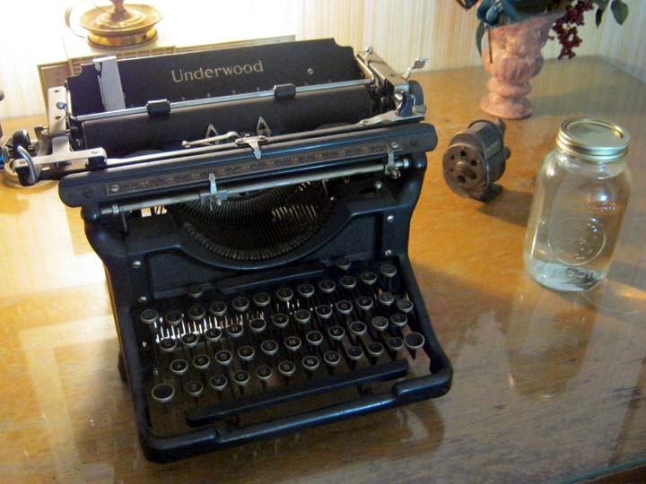 Every writer’s dream: A typewriter, a pencil sharpener, and a quart jar of moonshine.