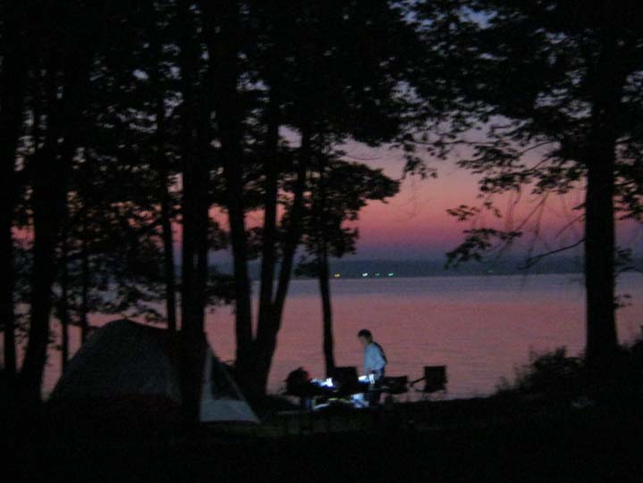 But I still got some amazing photos. In fact, last night Jeff called me out of the tent after I had already gone to bed to see the moon. It was rising over the lake (did I mention our campsite is right on the shore of the lake?) and it was bright orange. The reflection rolling across the black water was mesmerizing. The song Black Water, by the Doobie Brothers, took on a whole new meaning for me. We sat in silence for at least an hour, allowing it to transport us to altered states of consciousness. My camera doesn’t take very good nighttime pictures, but I tried anyway.
