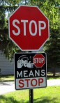 I was baffled by this sign. If someone really doesn’t know what STOP means, is telling them that “STOP MEANS STOP” going to help? It’s like telling a blind person that the sign is red (not that a blind person should be driving anyway). And if they do know what STOP means, will the sarcasm of this sign really reach their conscience and STOP them from misbehaving, or will it awaken their Inner Smartass and cause all sorts of illegal hijinks?