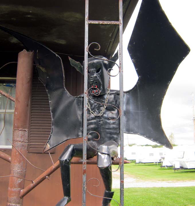 I have no idea WTF these things are, but they are on the porch of the office of a fenced-in boat/trailer storage yard near Andover, OH. I had to poke the camera through the fence to get the close up of this bat critter.