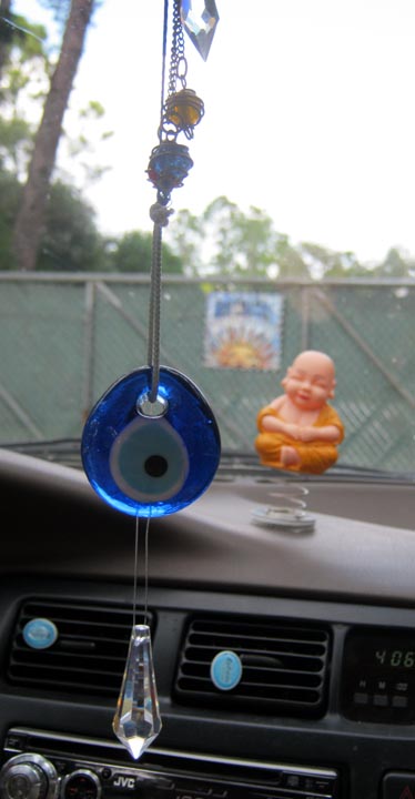 I’ve had the charm hanging in my car from the rearview mirror since then, along with my sparkly faceted cut crystal and my bouncing Buddha (enlightenment on a spring, don’t ya know) on the dashboard. I’ve never seen anything like it until I went to Tarpon Springs, a cute and kitschy Greek fishing village here in the Tampa Bay (I drag all of my out of town visitors to the Tarpon Springs sponge docks). I saw evil eye charms for sale in all the stores there, in all shapes and sizes, because the Greeks share the belief in them.