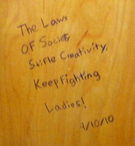 I don’t think I really need to say much more, do I? Oh, here’s a picture I took of the door of the ladies room in the little mall in the center of town. I think it sort of blends with the feel of the rest of the day, don’t you?