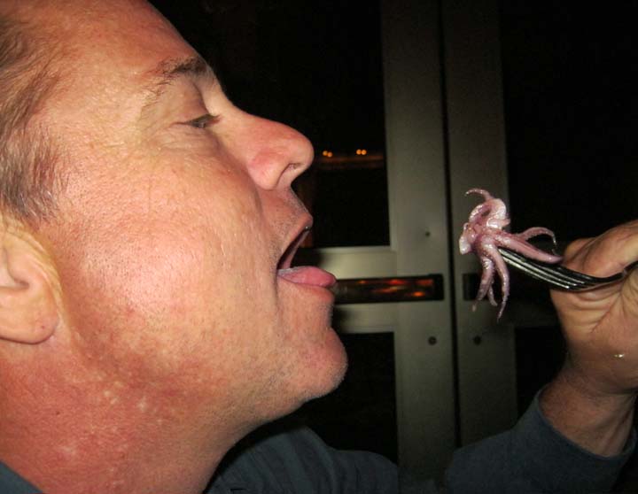 Jeff pretends to be about to eat squid from our new friend Tracy’s plate. Please note I said PRETENDS. That’s as close as it got.