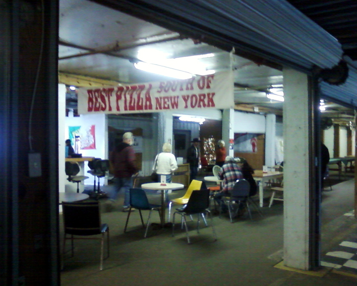 We went to the flea market today because our favorite Greek deli has a shop there, and I took this picture I’ve entitled Flea Market Karaoke. The couple singing (standing between the central pillar grouping) were very good. However, even the poor quality of this picture cannot convey the overall grunginess of the scene.