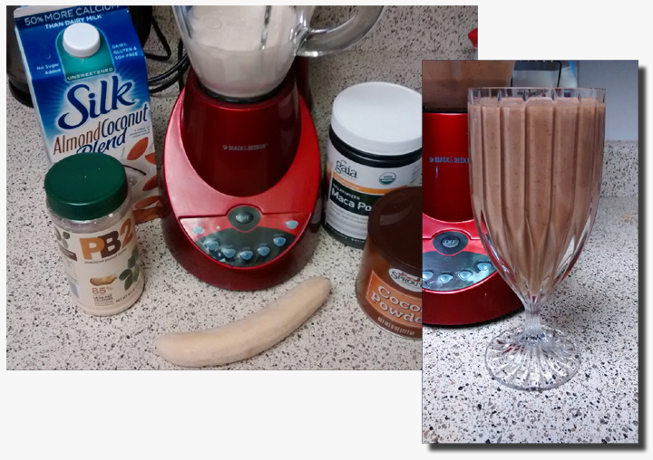 In case you’re interested, the smoothie is one cup of almond/coconut milk, one banana, 2 tbsp. ground flax seed, 1 packet stevia, 2 tbsp PB2, 1 heaping tbsp cocoa powder. YUMMY!
