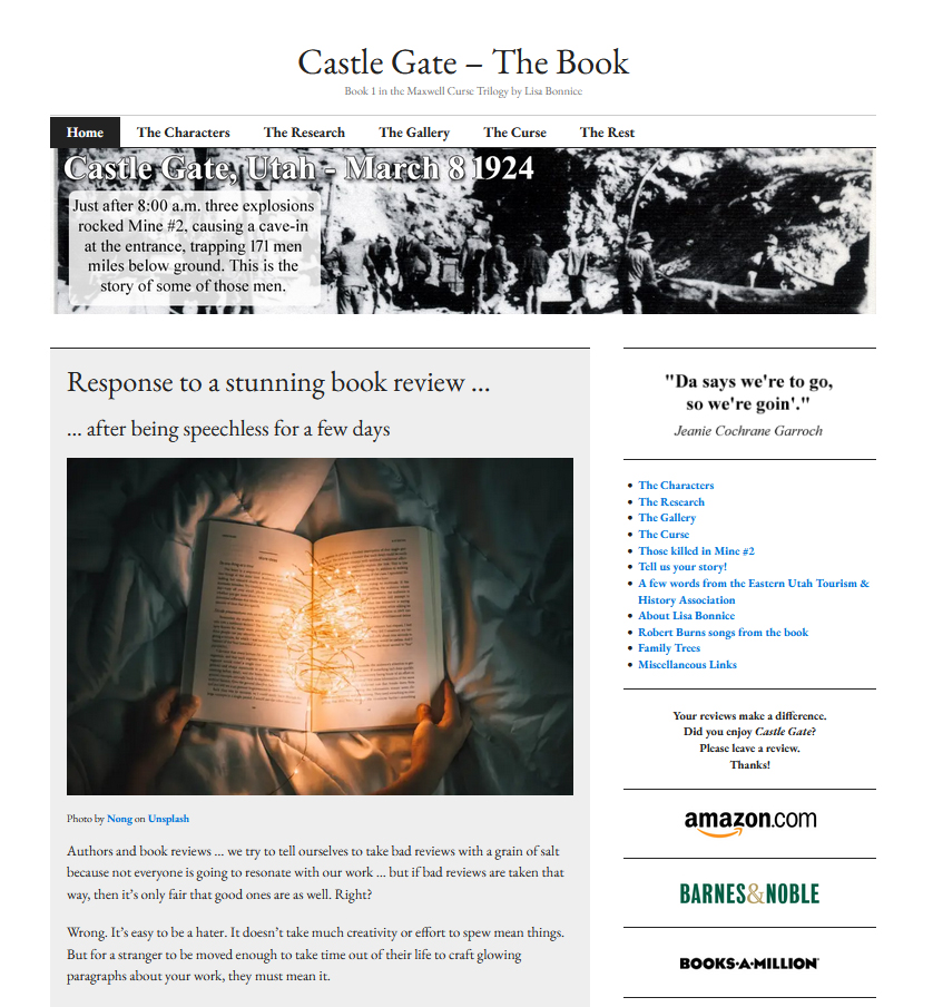 “… what you now hold in your hands truly is a rare “LITERARY UNICORN.” It is an amazing, well researched and creative historical telling of the story … what you hold is a piece of art, square-bound in a canvas of papers. It is a love-letter to Lisa’s ancestors celebrating their contributions in a now almost forgotten time, in a mostly forgotten place, called Castle Gate.”