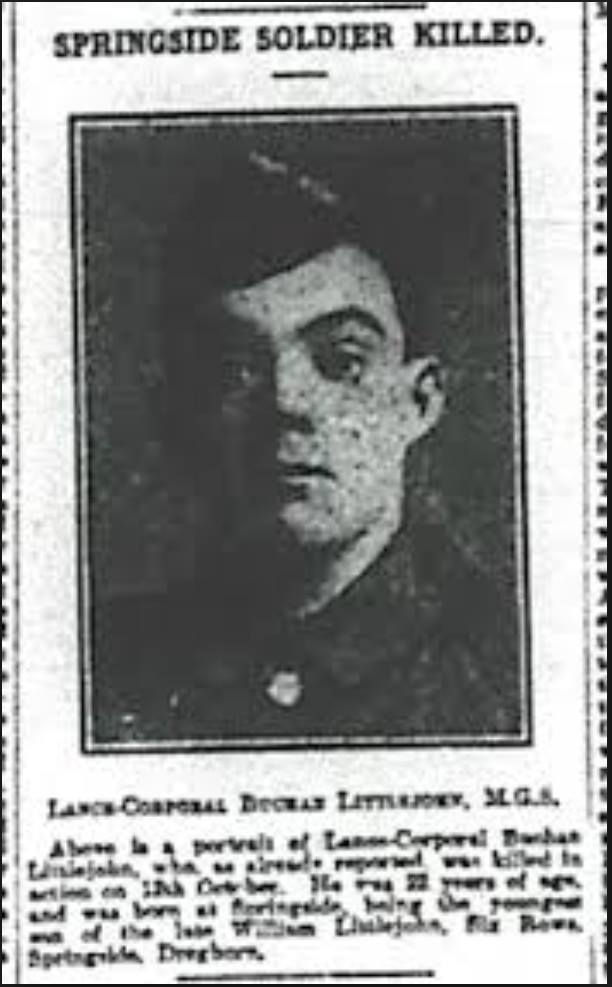 Buchan joined the Royal Scots Fusiliers shortly after WWI was declared. He was sent as a Private to France and was almost immediately wounded, and sent home in July 1915. He spent eight months convalescing before being sent back to France in March 1916 as a Lance Corporal. He was killed in an attack on Bayonet Trench, during the Battle of Le Transloy at the Somme, October 12, 1916 and eventually buried at the A.I.F. Burial Ground in France.